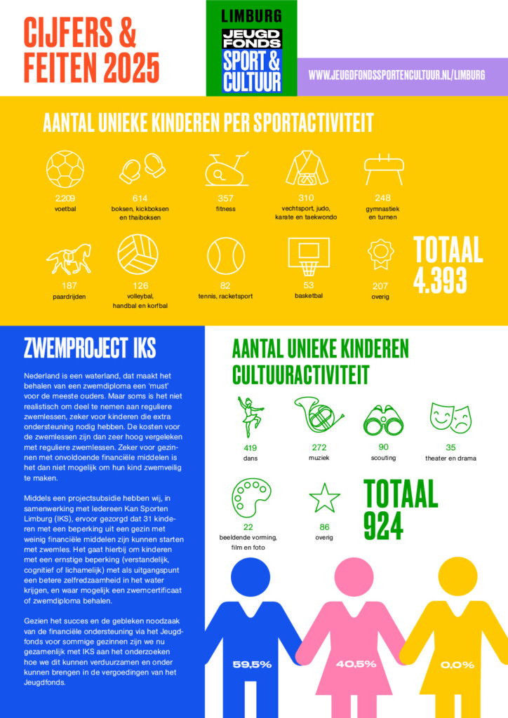 In 2025 hebben wij 6.251 kinderen in Limburg de kans gegeven om deel te nemen aan sportactiviteiten, cultuuractiviteiten en zwemles. Daarnaast heeft ons collega-fonds in Venlo nog eens 849 kinderen ondersteund. Samen hebben we vele kinderen laten meedoen –  kinderen voor wie dit zonder financiële ondersteuning niet vanzelfsprekend is.